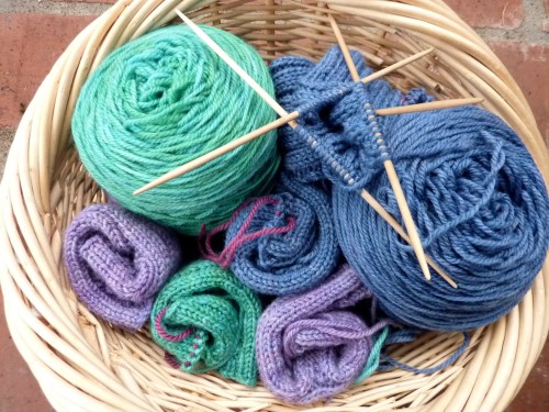 What else is going on? You know all those ancient Greek tragedies, where the hero is brought down by his own hubris? I’m living a knitterly version of it. I’m working on a little design project. I liked my prototype that I knit out of stash yarn (purple), and felt ready to jump into the real thing with one little change planned. I was feeling pretty confident, as you know from my last post. Right now I’ve got a basket o’ chaos.