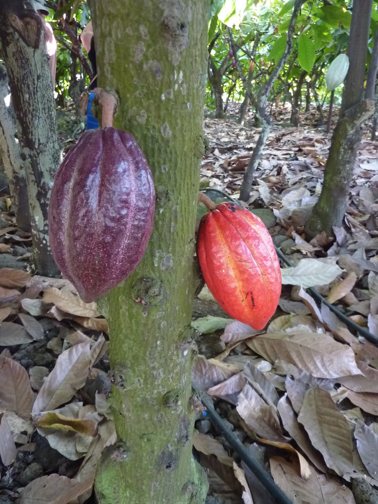 They come in different colors, but they all make chocolate. Inside the pod, the beans are covered with a white sticky substance. Geckos find it delicious.