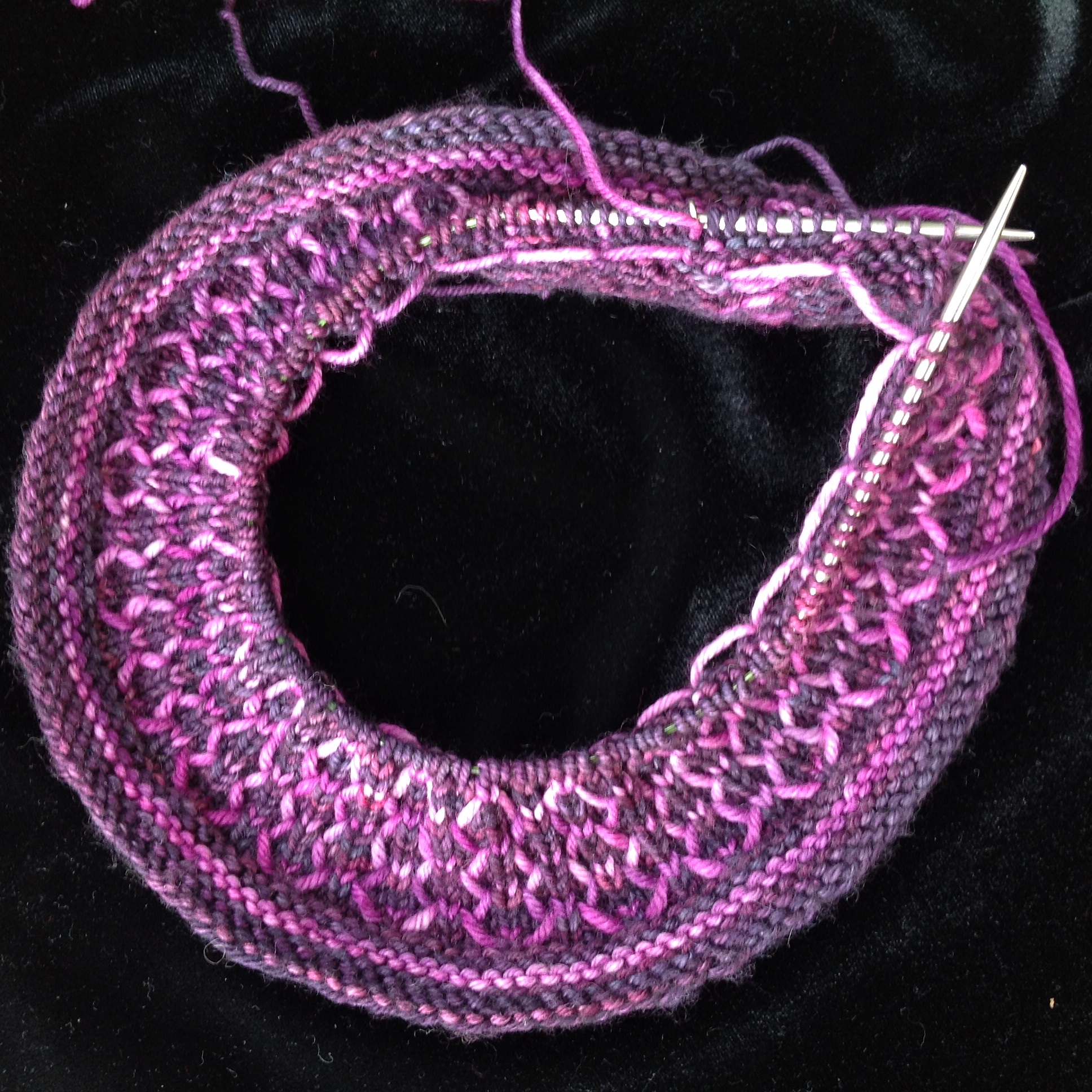 And I still may. But right now, the hat is humming along. I’m using Malabrigo Arroyo in Purpuras and Borrajas, and I love the way it looks.
