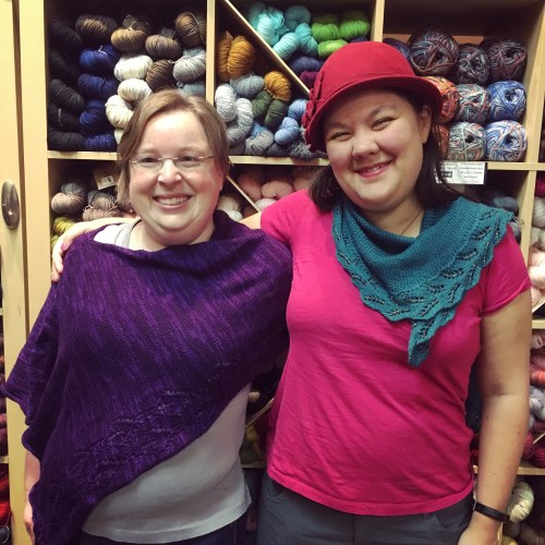 Marlene and Terri came by to show off their Tilt Shift Wrap and Fern Shawlette.