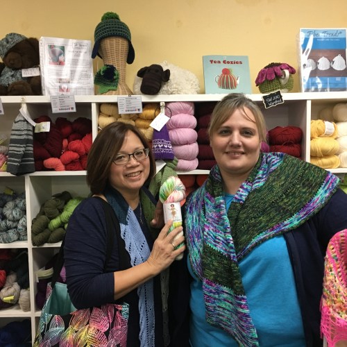 Fellow Pie Bird (singing buddy) Claudia was working at Northwest Wools, so we had a quick catch up. She tried on my new SeaScape Scarflette, and it looked smashing on her.