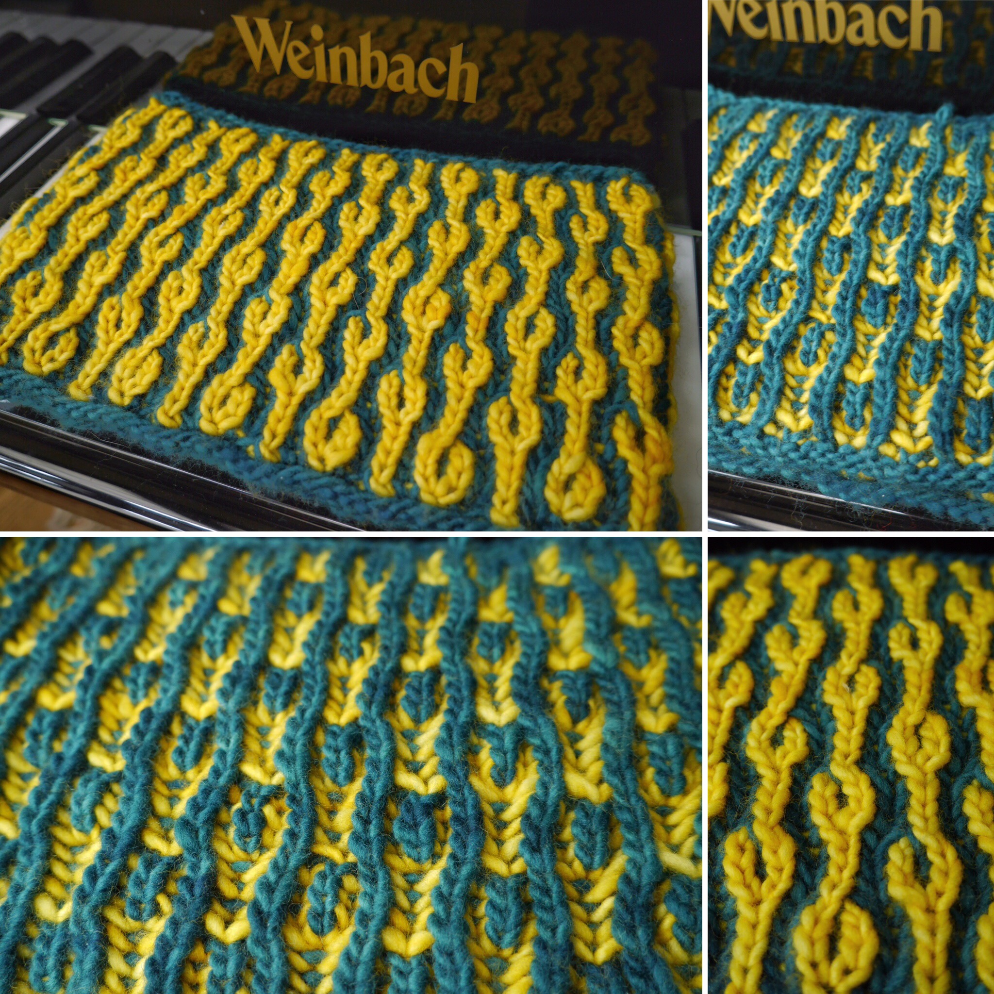 I knit this cowl for my sister. She’s a big University of Oregon Ducks fan, and the swirling circles made perfect O’s. After the perfect mirror symmetry of plain brioche rib, I was startled to see how different the front and back sides of patterned brioche are. Cool!