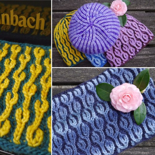These are the three hat patterns in the Brioche Hat Trick e-book, available through Ravelry as a pdf download. I went for a botanical theme, so they’re Clematis Seed (the swirly seed pod), Golden Chain (Laburnum tree), and Heliotrope (heliotropism is the directional growth of a plant towards sunlight, and the leaves on this hat are seeking the sun.) Clematis Seed is the simplest of the three; it’s plain brioche rib until you get to the swirly top. Golden Chain and Heliotrope are great next steps with a bit of simple increasing and decreasing to form the stitch patterns.