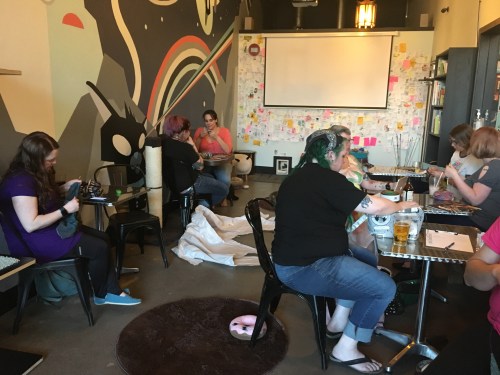I had the pleasure of hanging out with 16 knitters, and a group of kitters, last night. It was the first ever Knitters with Kitters event at Purringtons Cat Lounge. It sold out quickly. I’m pretty sure it won’t be the last!