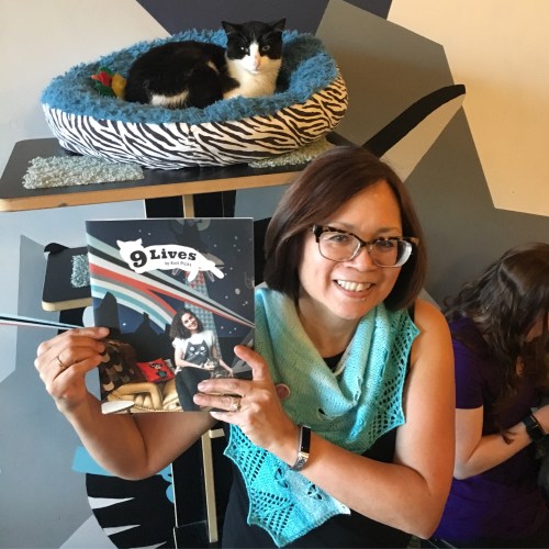 We had some great product tie-in. Stacey from Knit Picks came with copies of their 9 Lives Collection, a very fun book of patterns. The photographs for this 2017 book were shot at Purringtons! We had a copy for each of the attendees, and then a drawing for a cat-themed tote bag, and a set of interchangeable needles.