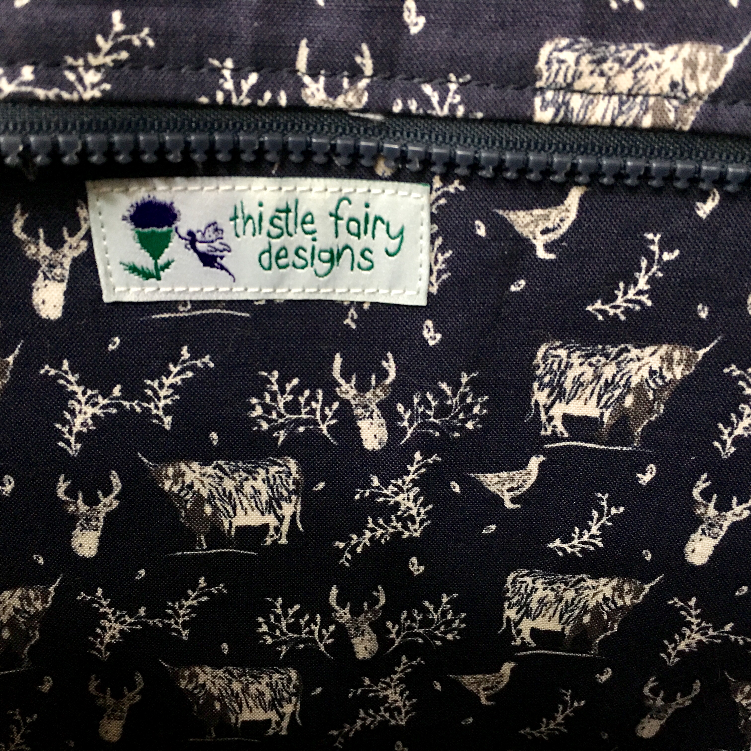The fabric lining features Highland cattle (hairy coos!), stags, heather, and pheasants? grouse? All very Scottish.
