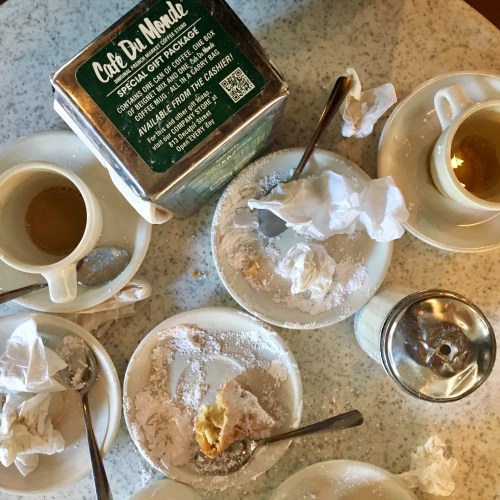 We had beignets and café au lait at the original Café du Monde in the French Market, the venerable original purveyor of these tasty bits. No picture until after we inhaled them.