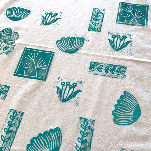 Sharyn brought supplies for block printing on tea towels. I brought some of my previous blocks, and carved a new flower block. I purchased these bags last year in Sisters during the Lantern Moon retreat, but hadn’t gotten around to printing them yet. Done!