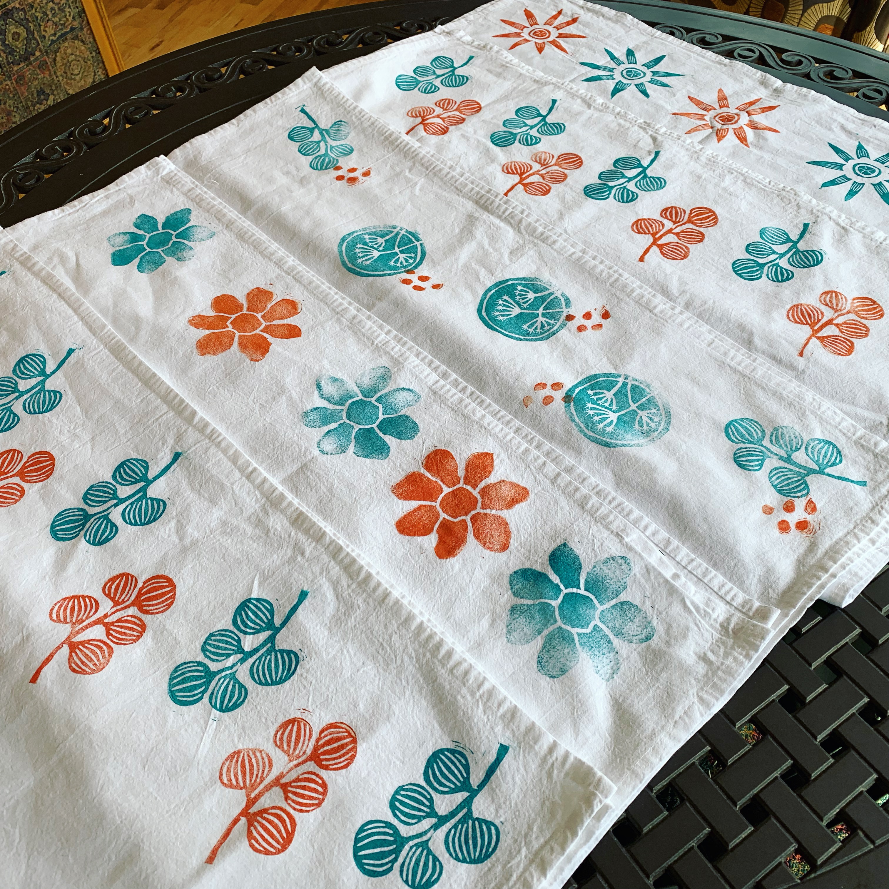 I’ve been playing with more block printing on fabric. I’m kind of in love, here. We did these at Vickie’s in Ellensburg last week, but I carved two more blocks when I came home. The small circle is for making a contrast cener to the flower block. Looking forward to printing these.