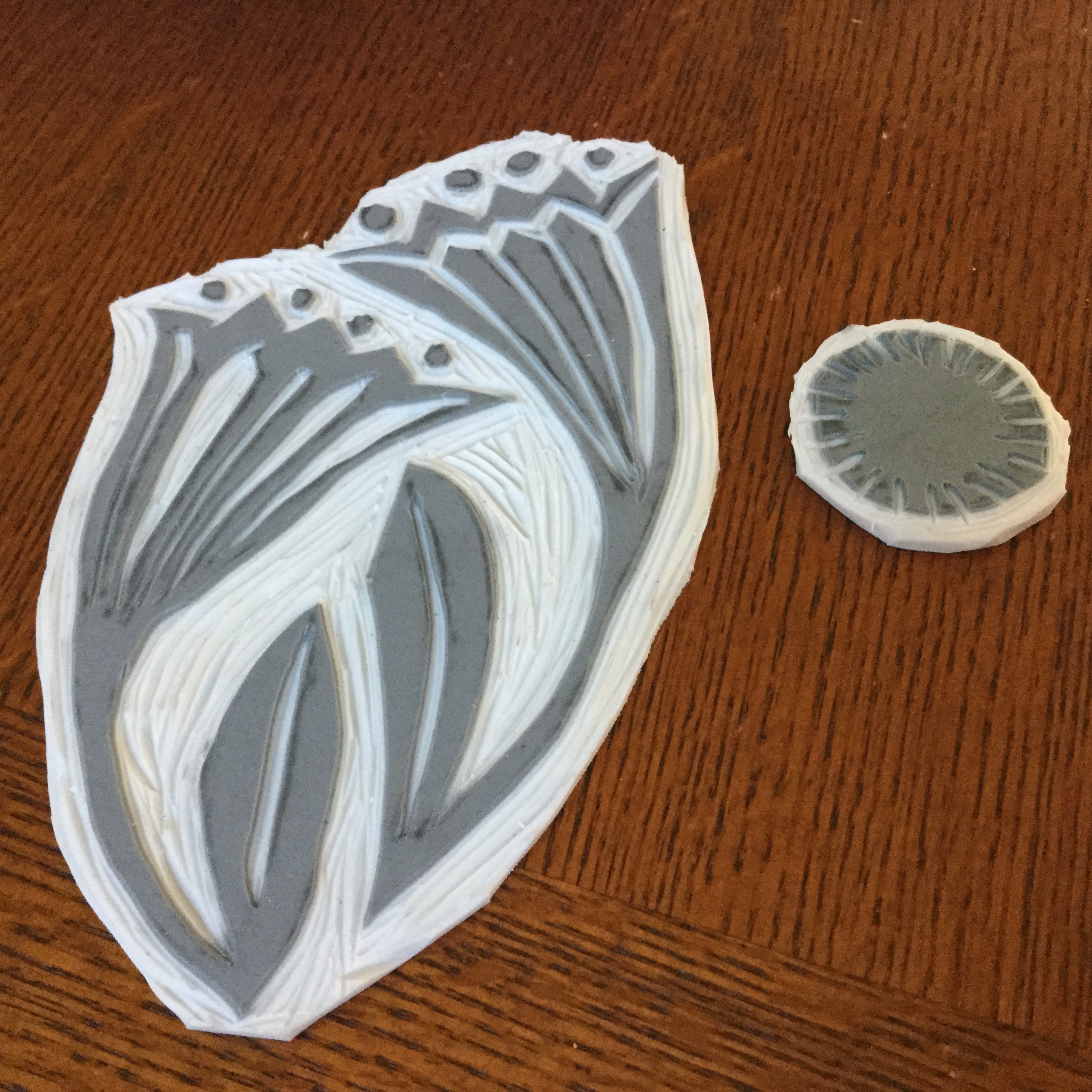 Linoleum is a lot harder to cut! We’ve been using rubber block. Most recently it’s this product, which has the added advantage of being layered, so you end up seeing what your print is going to look like. No guessing about if you’ve cut deep enough to not leave stray marks. https://www.dickblick.com/products/blick-readycut/