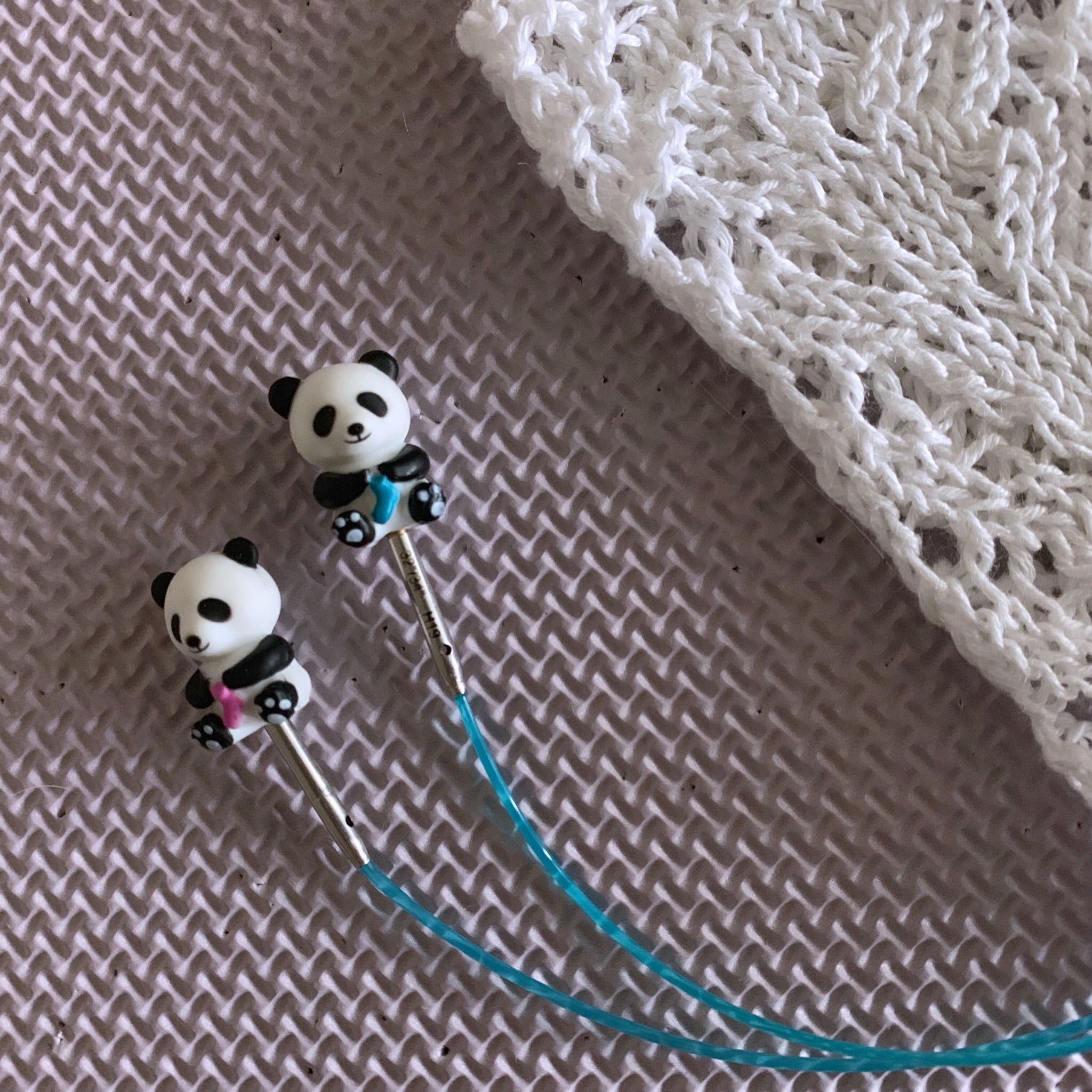 Note that the stitch holders are cables from my HiyaHiya stainless circulars, with their cute panda stoppers on the ends. I’m doing the actual knitting on my Lantern Moon ebony circulars, because that’s what I swatched with.
