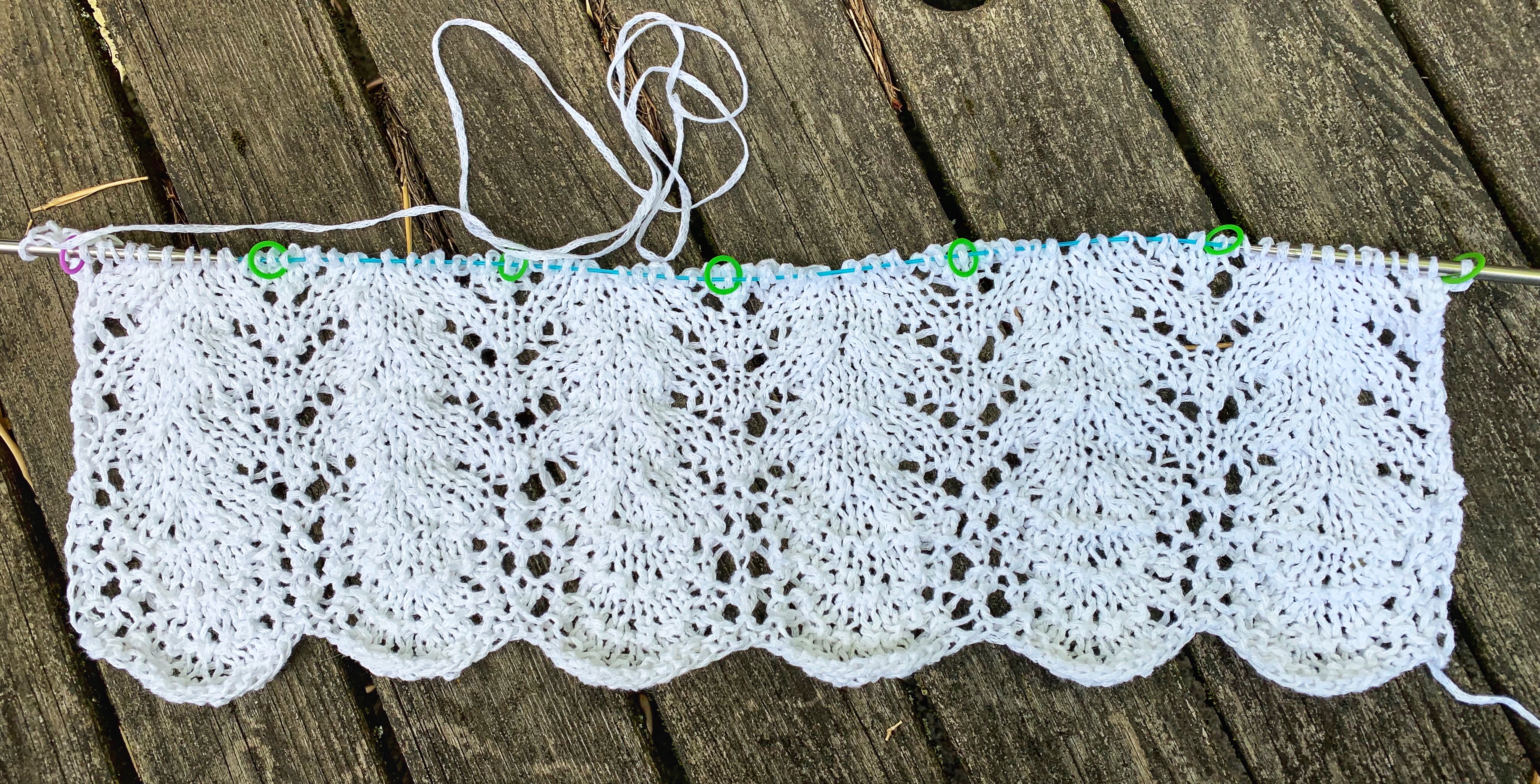 Stitch pattern is a bit of old shale lace at the bottom, along with something above it that I found in a Japanese stitch dictionary. If it has a name, I don’t know it!