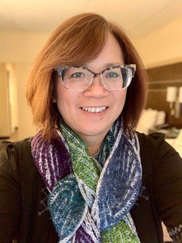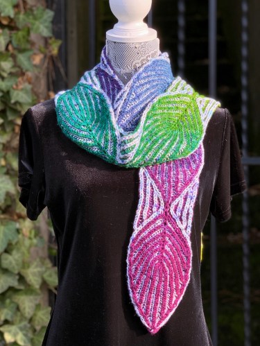 Aspen Leaf is a leafy brioche scarf. Butterfly wing-shaped wedges are introduced in syncopated brioche as the leaves narrow and widen. The leaves are especially glorious in a gradient main color, and a speckle or semi-solid makes a nice background. The leaf pattern repeats 10 times using two 4 oz skeins of DK weight yarn. You could easily substitute two 4 oz skeins of worsted weight yarn for a slightly wider scarf with fewer repeats.