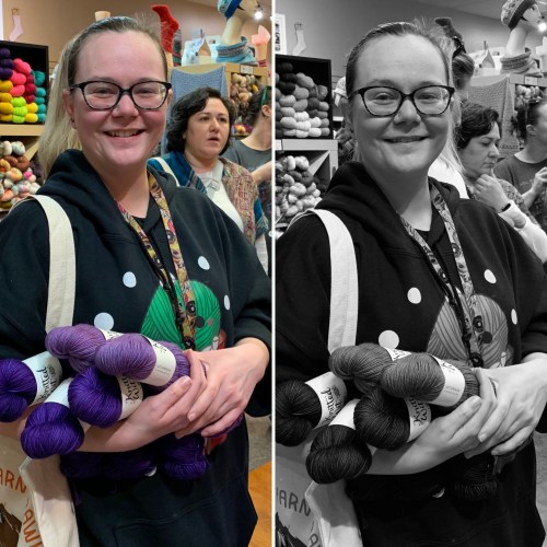 I showed Julie how to use her phone’s camera filter to check for good tonal contrast so her colorwork will have some pop. Do you know the camera filter trick? Use the Mono setting (alas, they’ve done away with Tonal) to make sure you’ll be able to see your colorwork! This is a gentle contrast, but enough to show off her colorwork knitting.