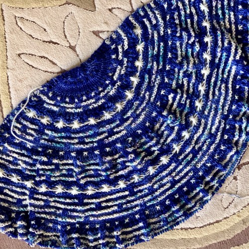 I would participate in a KAL. I love this shawl. I was curious about it when I saw a little of it in your VVKL blocking class or in the Knit Picks interview you recently streamed, can’t remember where I first saw it. The darker blue solid is so gorgeous and makes the lighter yarns pop so much more than the lighter blue solid.