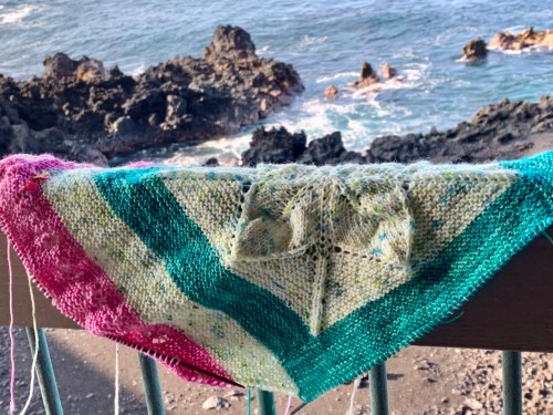 I kept telling myself it was okay, but the pink still looks like a tacked on afterthought. The shawl was reading as way more green than pink, and it’s the pink that I’m most interested in. Over the course of vacation, I got word that this pattern will be featured by Knit Picks in spring 2022 for the IDP program, and the thought of it not being perfect made my stomach hurt. So I started poking at using a different color with the Poseidon and Italian Ice.
