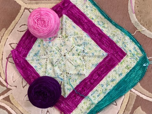 I love that first pink, just not in combination with the other two colors. And I never know until I start knitting, although this time I had my suspicions. The yellowy background on the speckle looked white on the website; It’s hard picking colors without holding them in my hand. I love your shawl!