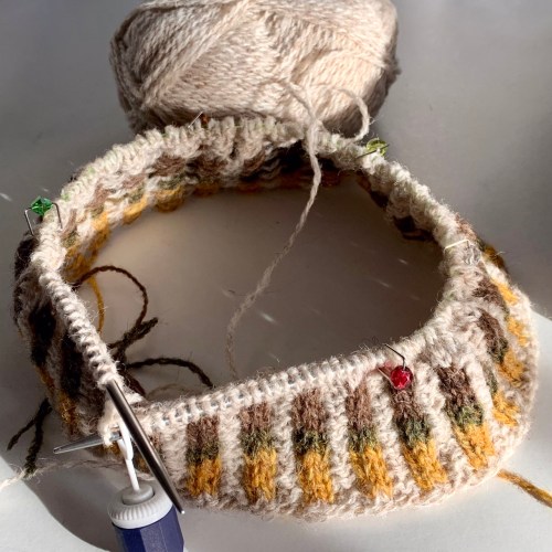 I’m knitting Da Crofter’s Kep, a free pattern from Shetland Wool Week. The pattern uses 6 colors, but only two colors per row, which is standard for stranded colorwork. I’m terrible at putting colors together, but Anne at For Yarn’s Sake has my back, with color kits of Jamieson’s of Shetland Spindrift yarn, based on the color sets in the pattern.