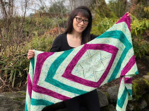 The colors I chose didn’t want to play along. I think the stronger colors I chose required a simpler, less busy layout. I ended up writing a new pattern, Camellia Wrap. Camellia Wrap is a streamlined version of Cherry Blossom Wrapture. It’s simpler in that there’s just one way to lay out the colors, and there’s only one lace motif for the logs. I did all the thinking so you don’t have to; you just get to knit!