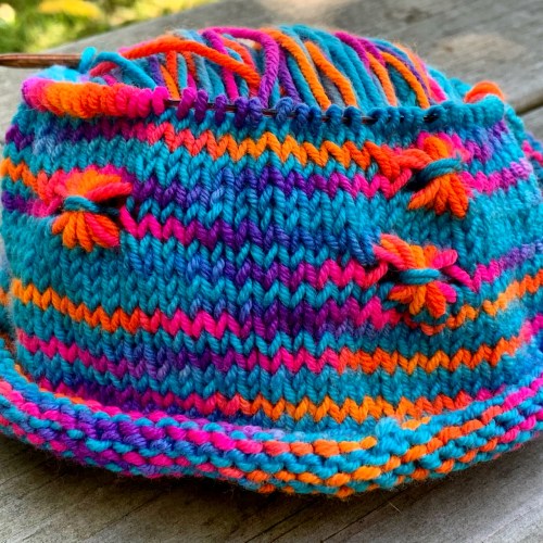 So I’m playing with assigned pooling. If the yarn is orange, it’s time for a sunburst! They’re slightly pink at the edges, because I want them to be 5 stitches wide. I like them! But, as is usual for my design process, I’m probably going to frog this (again!). I thought I’d like the rolled brim, but it wants to keep rolling, and that makes it hard for me to know when to start the crown shaping. I think I’ll like a sleeker k2p2 rib.