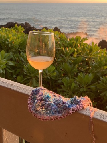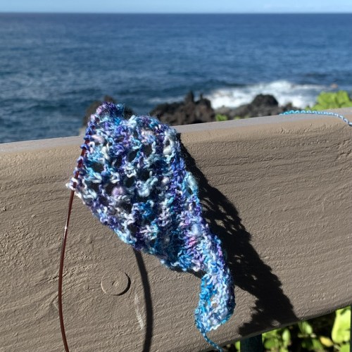 Well, I did the math and swatched the stitch patterns I wanted to use, and tried a couple needle sizes. Then I cast on. And I decided…that my design required too much counting and thinking. I was on vacation! Also, I had swatched with the pink yarn, and the stitch patterns didn’t show as much as I wanted them to in the variegated yarn. I love the variegated version (Unicorn Dreams). Summer Slubbing wants to be an easy-going knit. Nothing complicated.
