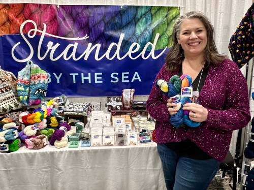 Tara from Stranded by the Sea gave me the yarn that turned into Fired Up last year (see it over her shoulder?), and had lots more pooling yarn this year in both fingering and worsted weight.