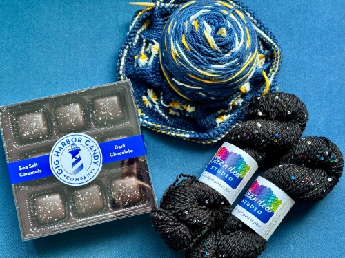 I picked up some Starry Night to demo in my assigned pooling class, and also picked up sparkly yarn…and chocolate.