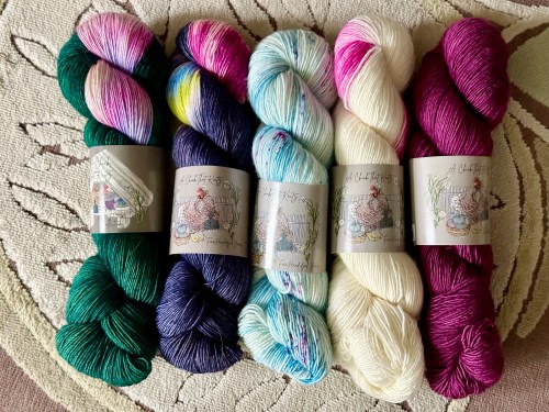 I picked up some more yarn inspiration from A Chick that Knitz. Three are pooling yarns. The teal green on the left is by itself for a single skein project, and the other two pooling yarns may or may not be combined with the variegated or semi-solid to their right. We shall see.
