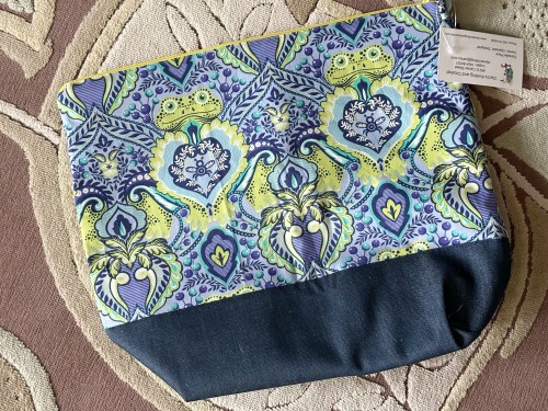 I came home to find this gift from Chilali Hugo, a Facebook follower. She sent me this frog themed project bag because she’s been knitting so many Portland Frog Hats. This bag is lovely; it has six pockets inside for organization, and is big enough for a small sweater project. I love it! Thank you, Chilali.