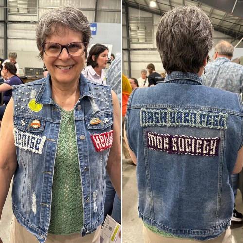 Denise really caught the Knit Hello bug! She knit hello, her name, and couldn’t stop. Good thing she found a thrifted vest to display her tags and pins!