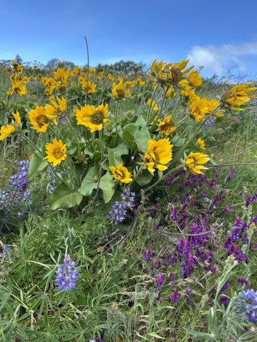 yellow balsamroot, blue lupine, purple vetch, blue sky