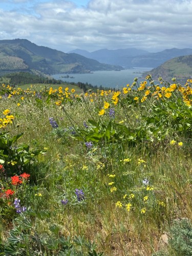 So many flowers! See Mount Hood just peeking out under the clouds on the right?
