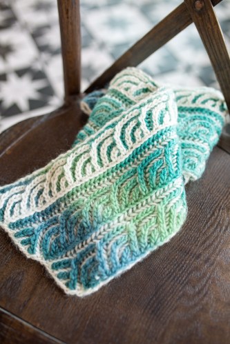 The Seafoam Latte Scarf is a two color brioche scarf, knit flat. Regular increases and decreases create the rhythmic wave pattern. Syncopating the third wave highlights the crest of the wave. I’m looking forward to using this pattern in brioche classes.