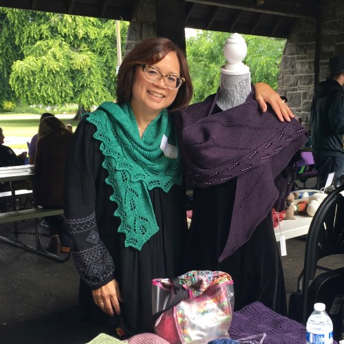 I also sat in on Franklin Habit’s mosaic knitting class. I’ve done lots of slip stitch knitting before (most recently Half the Knit Sky), but not actual mosaic knitting, as defined by Barbara Walker. I learned a bit about how to chart mosaic knitting, and considered playing with different textures. All garter stitch? Garter on stockinette background? Stockinette on garter background? My personal preference is garter on a stockinette background, like in Half the Knit Sky and my Dotty Cowl and Dotty Cake hat.