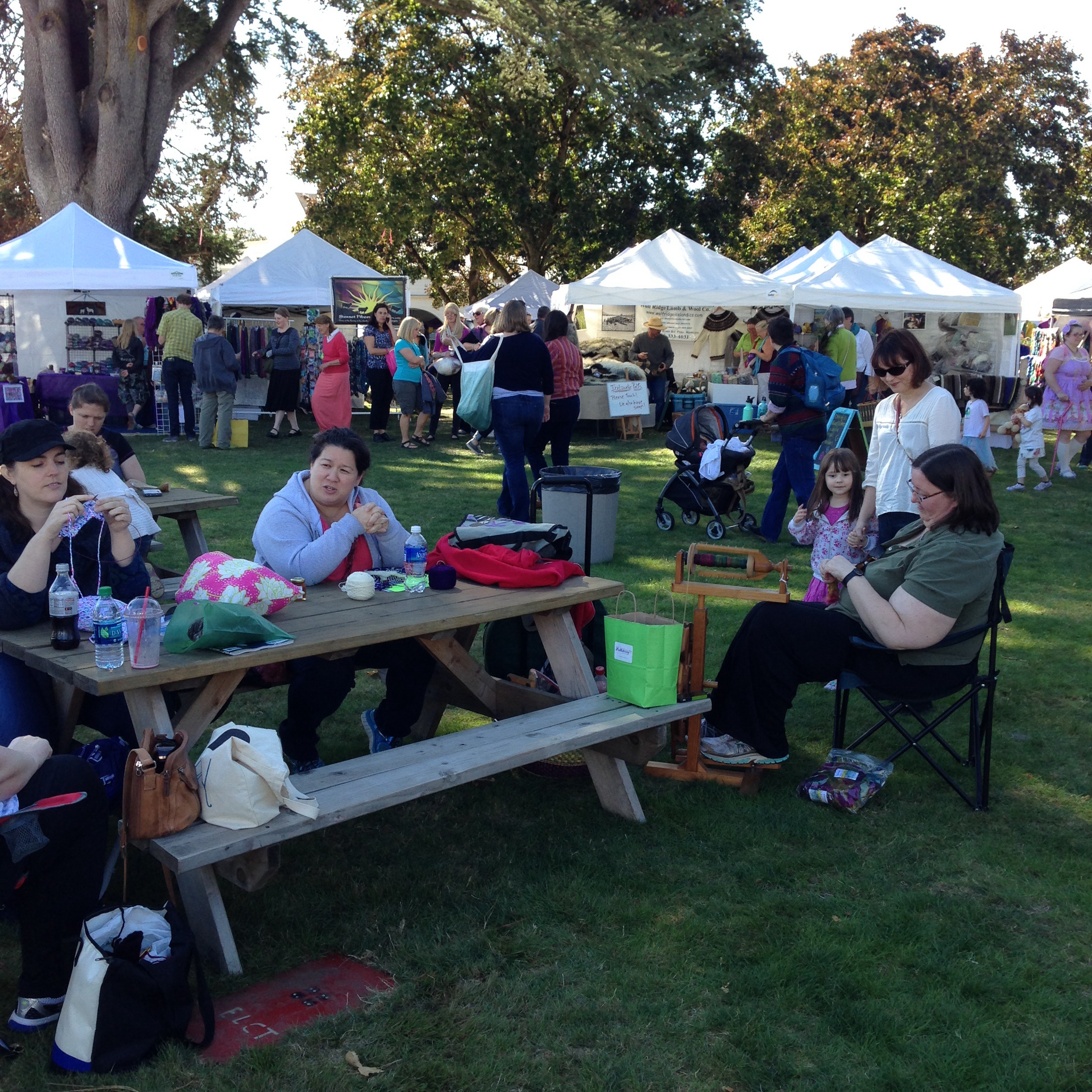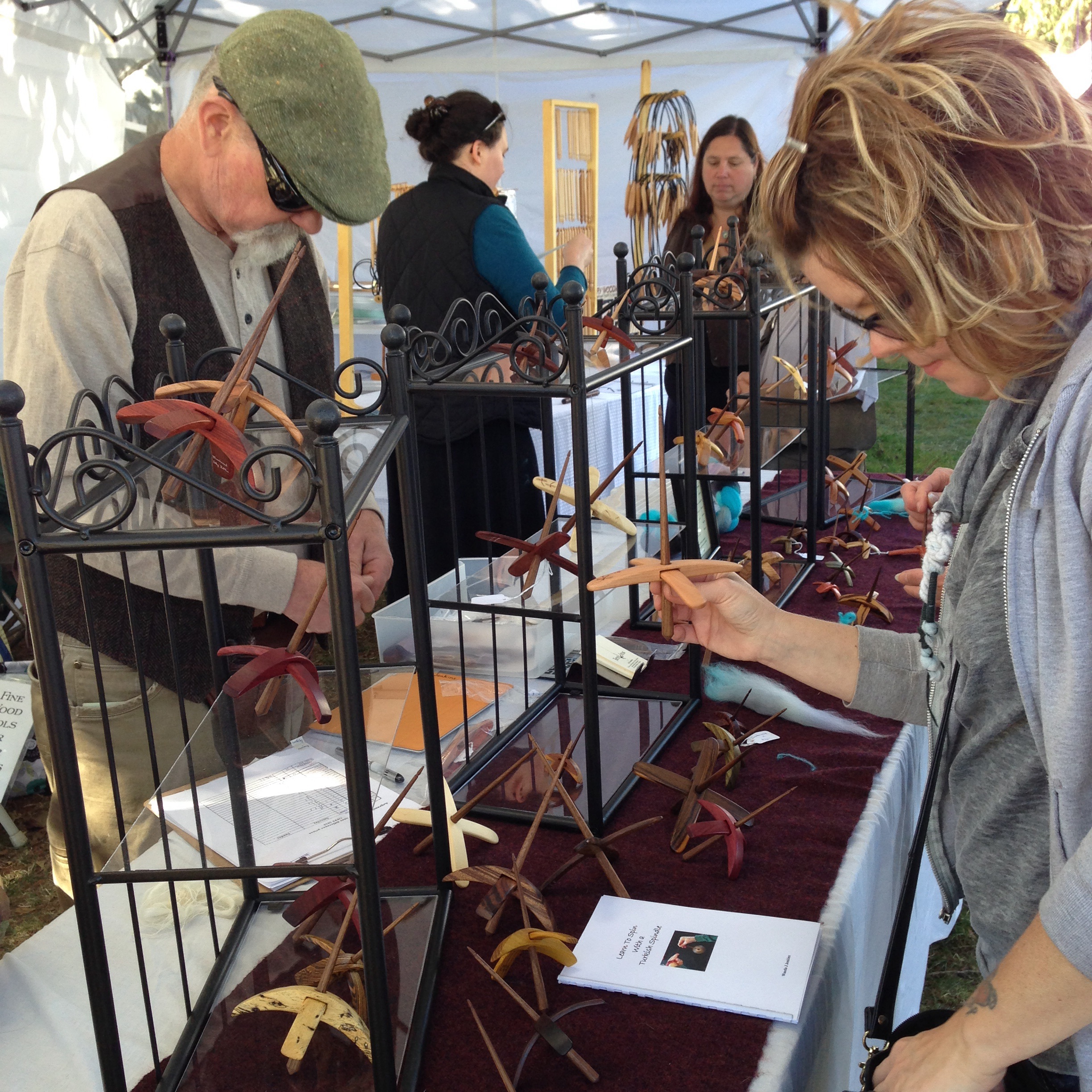 Sari Peterson with her grands at her booth. Her DH makes beautiful spindles. Sari teaches spinning, and I think I may need some lessons! First to refine my spindle technique, and second to try a wheel. Not that I want one. Just curiosity about how they work. Honest. (Heading down the rabbit hole? Over to the Dark Side?)