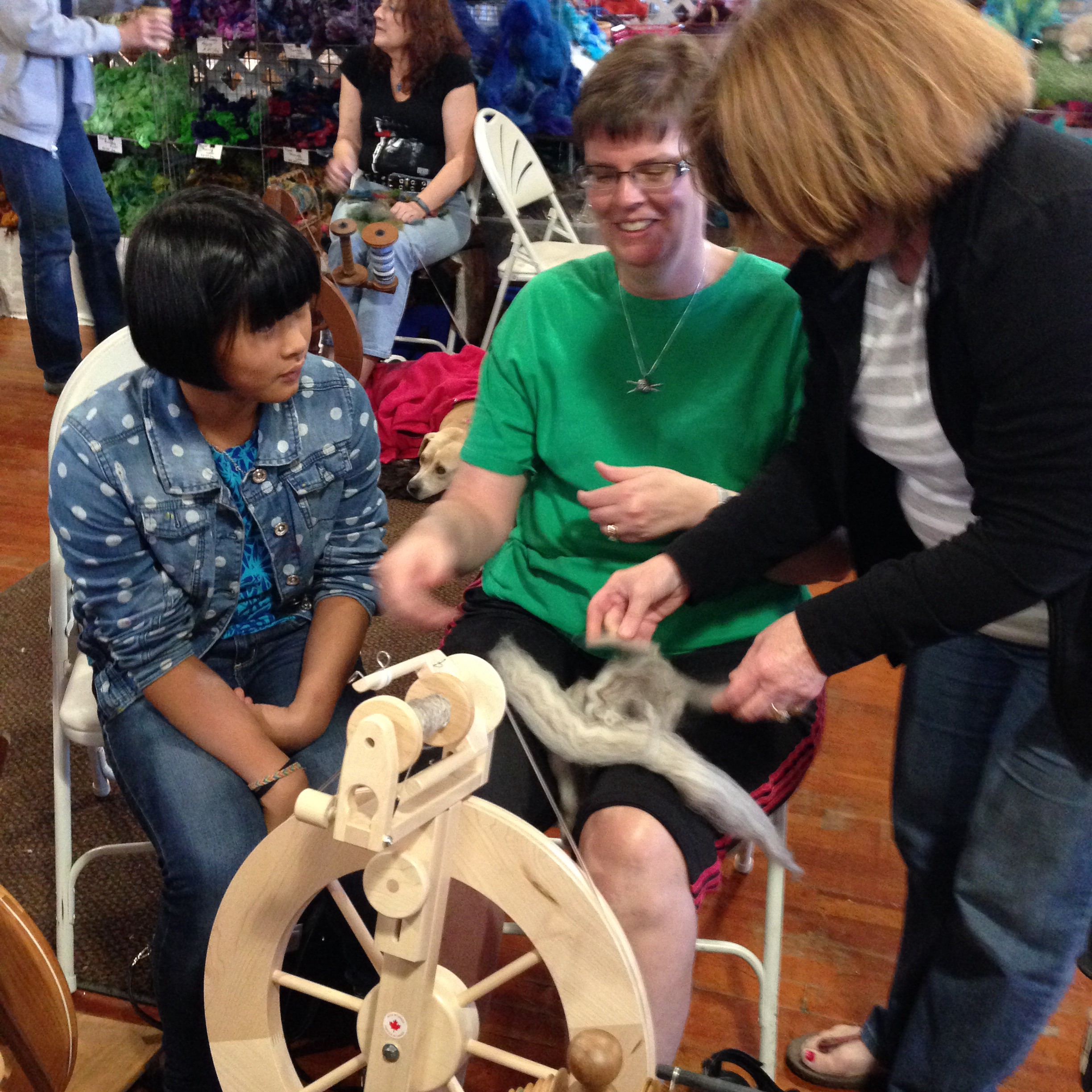 Leigh Anne in the Carolina Homespun booth, trying to decide whether she should take up spinning