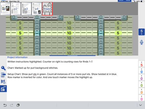 Remember that I said that Knit Companion works for all pdf patterns? That means all pdfs. I’ve been using it for pdfs of patterns that aren’t even written yet. I can paste my chart in progress into a pdf and open it in knitCompanion, using the row and stitch markers while I edit the written instructions that are generated by my charting software. I can also make a pdf of my Excel spreadsheet’s written notes, and use that while I chart. No losing my place. Magic.