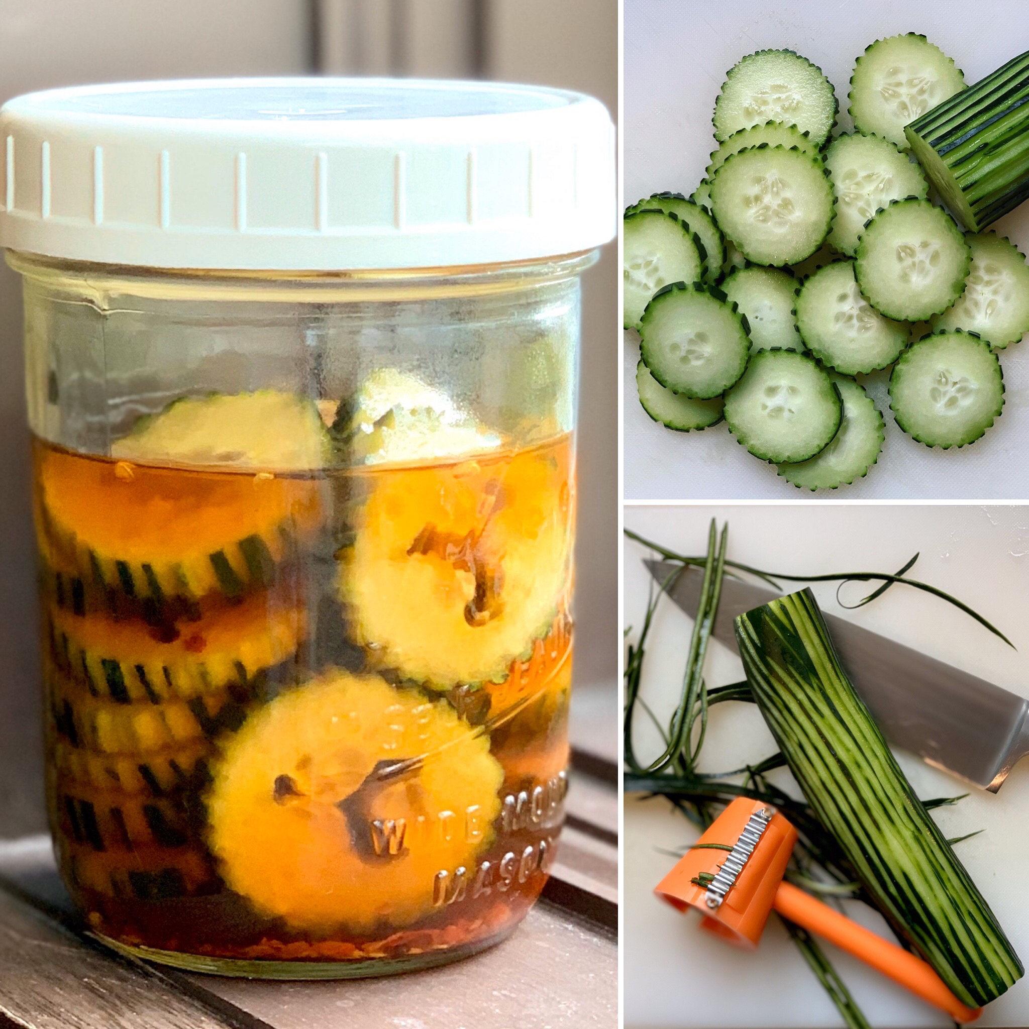 Cut cucumber into 1/4” thick rounds. Whisk all other ingredients together in a wide mouth 12 oz canning jar. Add cucumber slices. Refrigerate for 3 hours/overnight. They get spicier the longer you soak them! I take them out the next day and store them in a covered dish.