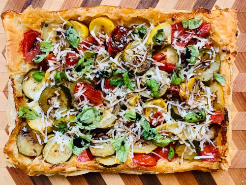 While your pastry is pre-baking, slice squash into 1/8” thin rounds. Slice tomatoes in half. On your pre-baked pastry (which you’ve stabbed to deflate), sprinkle parmesan, and arrange your vegetables, artfully, of course. Bake 20 – 22 minutes at 400 degrees, until pastry is brown and vegetables are done.