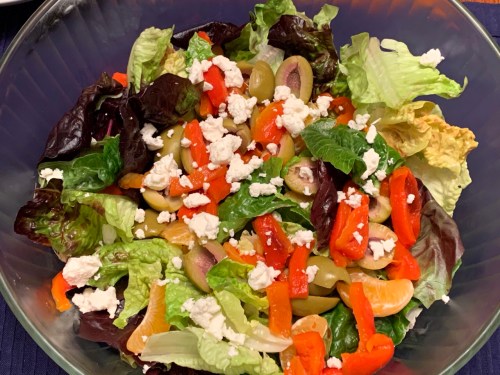 Salad with roasted red pepper, olives, tangerines, lemon vinaigrette (and some goat cheese left over from the dates)