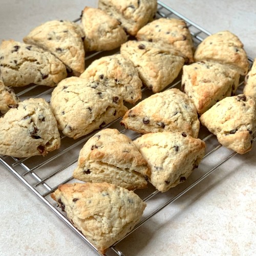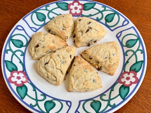 I’ve been making chocolate chip scones for decades. The ancient recipe lives on my refrigerator, and is getting harder and harder to read. It used 4 tablespoons of butter, and milk. They were nice, but not particularly luxe. Along the way, I’ve modified things a bit.
