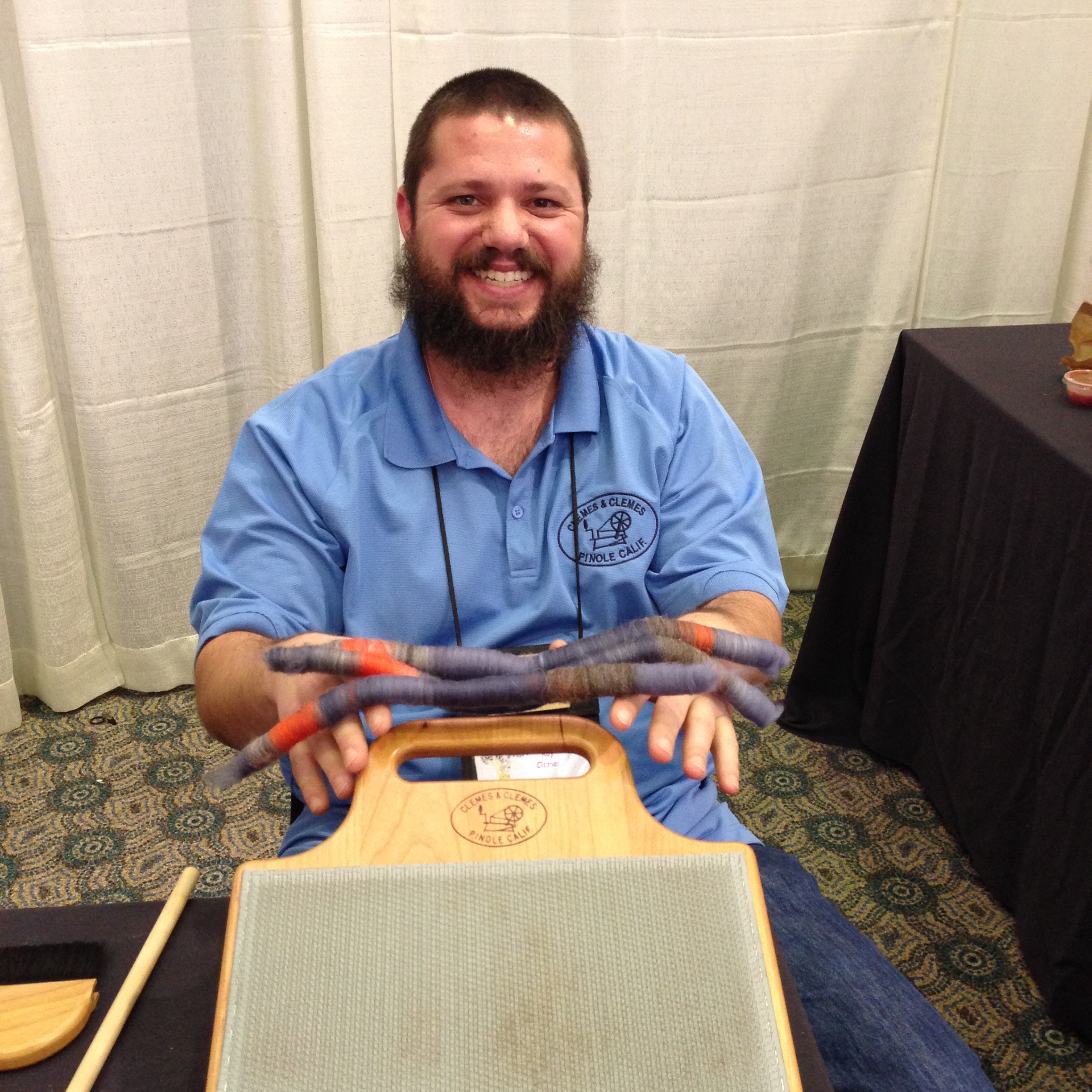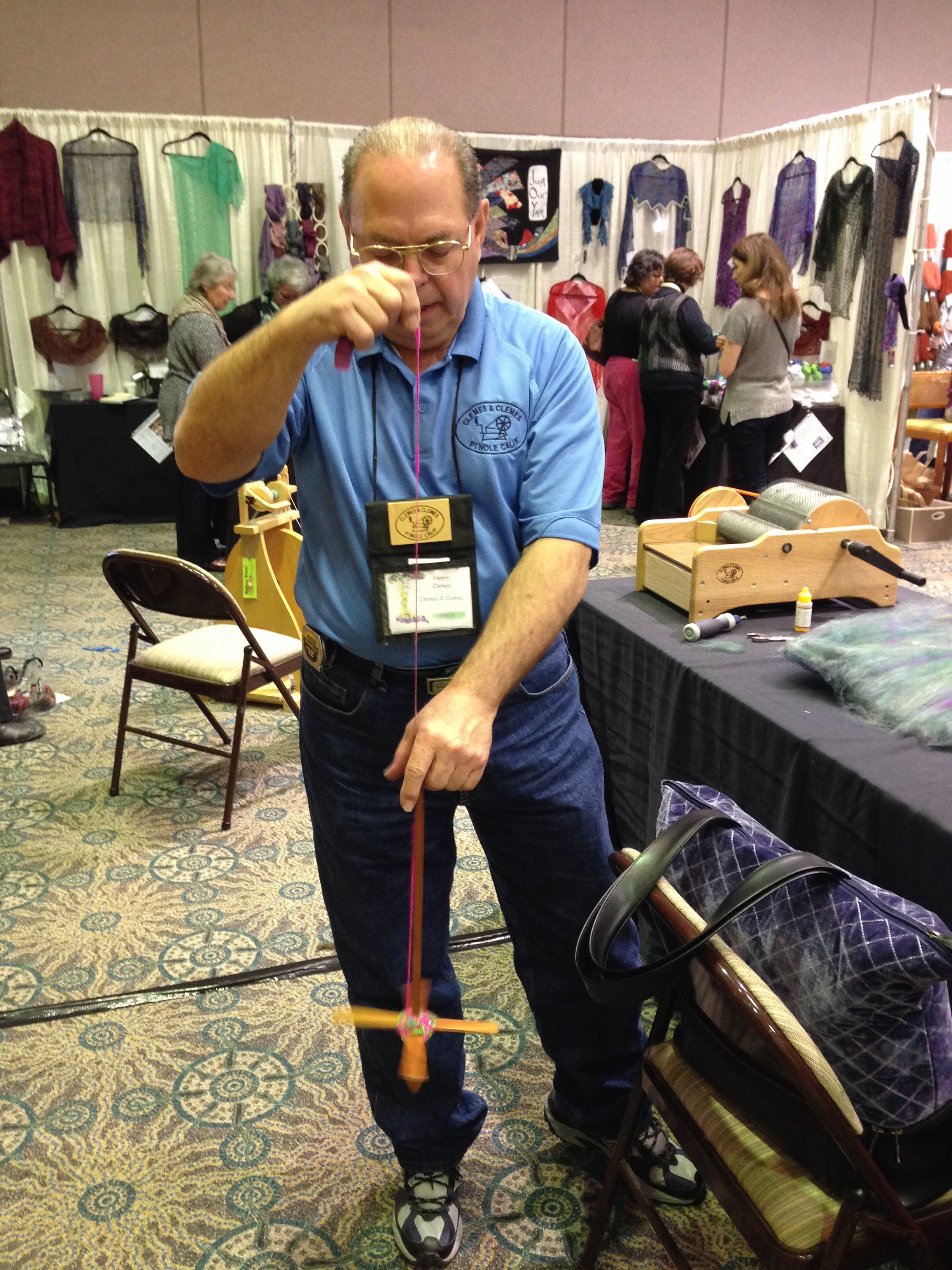 Carla McCoy from Pocket Wheels is a great spinning teacher. This is post-banquet; Anne Berk (Annetarsia) is getting her first treadling lesson. I’ve only spun on a drop spindle; I figured Anne could try this out. But the next day I tried it in the Pocket Wheel booth, and suddenly I was making yarn. So cool! And the little wheel fits in a tote bag.