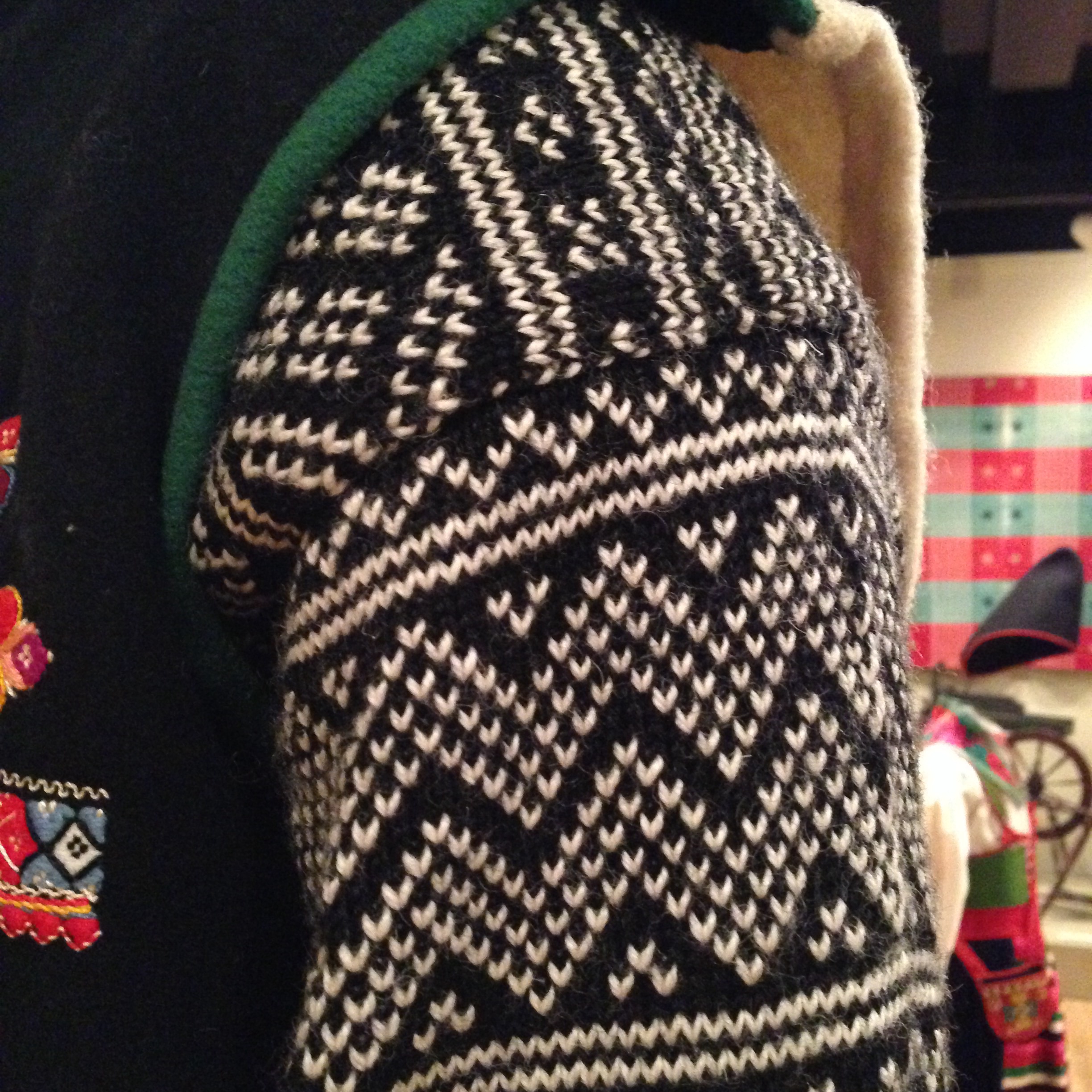 We worked this sample in the round. On the left you can see the front and back sides of the outside of my circular knitting. On the right is the inside, which in this case is a mirror image of the outside that’s shown on the left. But it doesn’t have to be, as you can see from the lower edge. We started with some ribbing, then moved into double knitting with one color (the white) on the inside and outside, and then moved to two colors. A logical progression.