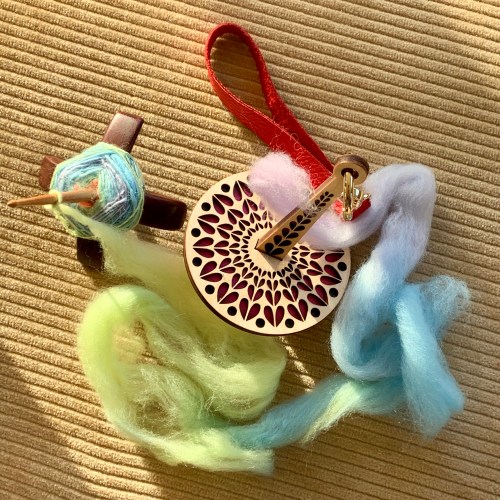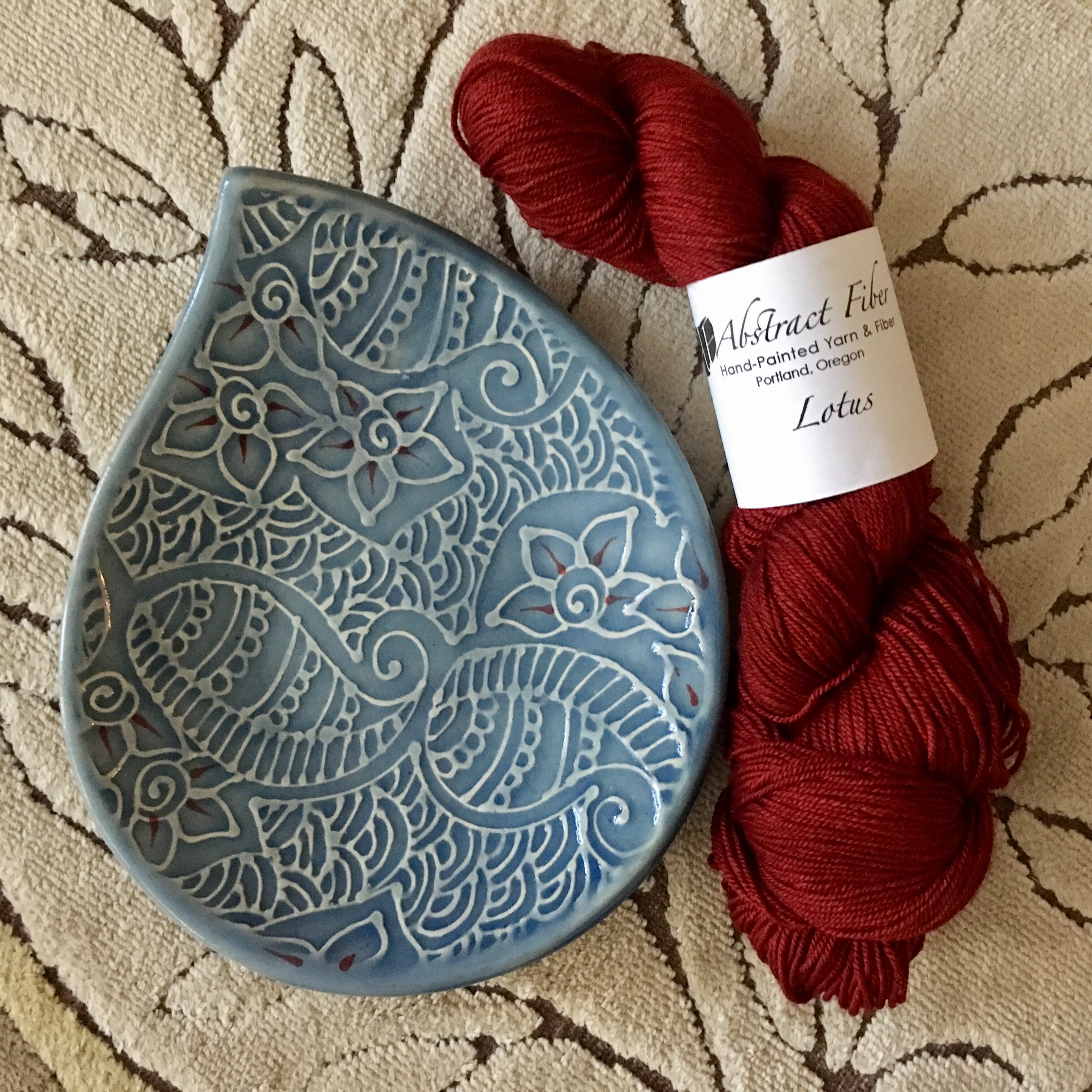 The second treasure is a skein of red yarn from Abstract Fiber. I compared this red across four yarn bases, and the gray undertone of the yak base made this Lotus fingering (20/60/20 Yak/SW Merino/Silk) an even more perfect match for my red boots. I’m knitting another Zephyr because my sister really wants one!