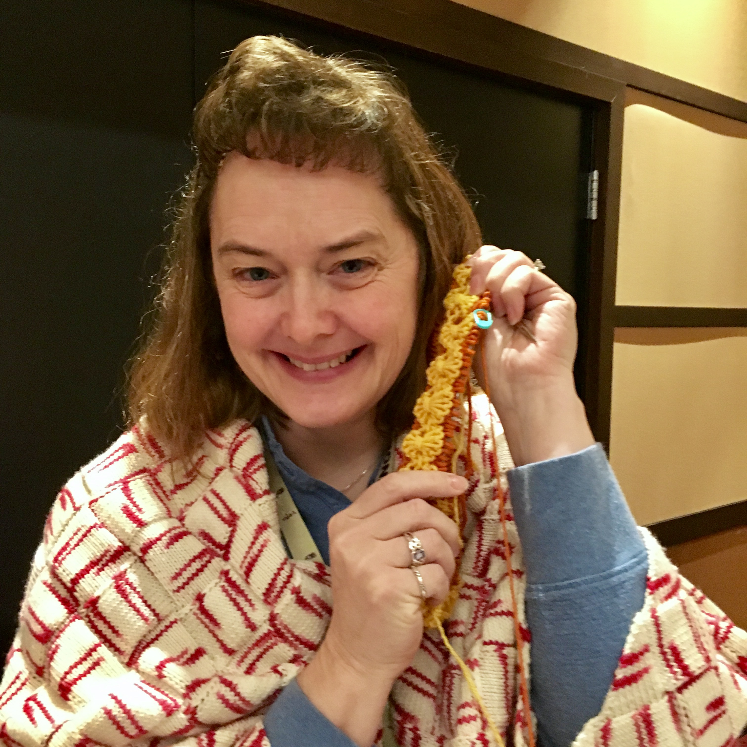 This scarf pattern is in our handout, and I’ll be working at least part of it to try to perfect my 2 color brioche technique. I enjoyed this class, and just wish it had been an hour longer! Or all day…