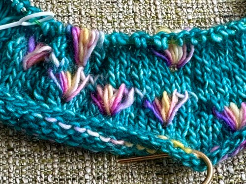 Choose a yarn that is dyed for assigned pooling, with an accent color run of about 8-10”/20-25 cm long. I used A Chick That Knits Singles Fingering in Tropical Flowers for mine. One skein is enough to knit the cowl as shown. You can make it larger, but you’ll need more yarn.