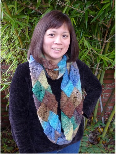 Infinity Entrelac Scarf: is an infinity, or loop scarf. This entrelac scarf earns its name twice: The center rectangles feature a lacy infinity symbol. This pattern can be knit with 100 grams/400 yards of fingering weight yarn, or 150-200 grams/540 yards of DK/light worsted weight. Gauge is approximately 6 stitches per inch in stockinette stitch with fingering weight yarn, or 5 stitches per inch with DK yarn.