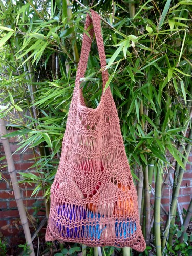 I designed this bag for Twisted’s Single Skein Club for June 2010. It uses one 50 gm/165 yard skein of Hemp for Knitting’s AllHemp 6, a DK weight hemp yarn.