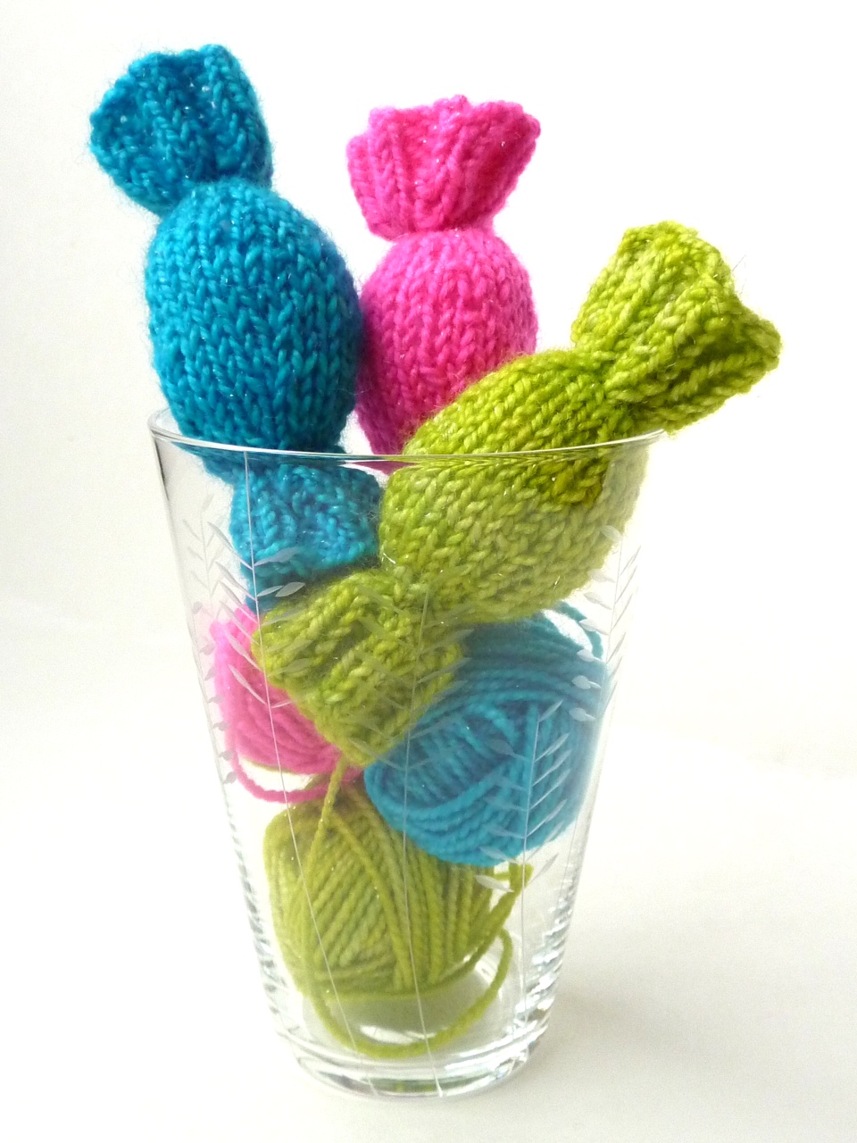 Daffy Taffy Twists are just the thing to brighten your day, and they’re calorie free, too! Knit in the round and stuffed with fiber, they’re a visual treat. One 45 yard mini-skein will yield 3 to 4 “candies” but why stop at one color? These are also a fun way to use up leftover sock yarn.
