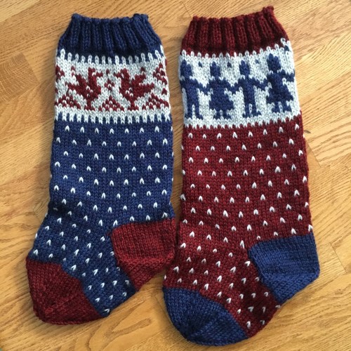 Snowflake Christmas Stocking: This pattern uses 75 gms of a main color, and 25 gms of each of two contrast colors. Gauge is approximately 4.5 stitches per inch in stockinette stitch, but gauge is not critical. It is knit from the cuff down on a circular needle, with dpns to finish the toe. Stocking measures approximately 20 inches long and 7 inches wide, measured flat (14 inch opening).